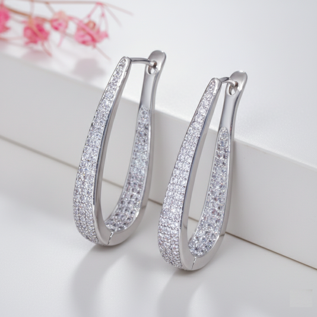 Elevate your jewelry collection with these striking Elongated Tapered Hoops. Each piece is meticulously encrusted with high-brilliance pavé stones that catch the light from every angle, ensuring you shimmer with every movement.